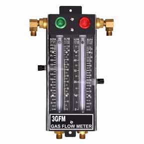 | Gas Flowmeter , Type 3GF with scale in NLPM & SCFH for Fuel & Oxygen Flow rate adjustment as per parameters for each wire. The flowmeter is offered with built-in NRV for safety protection against backfire, which does not allow reverse flow of the gases. |