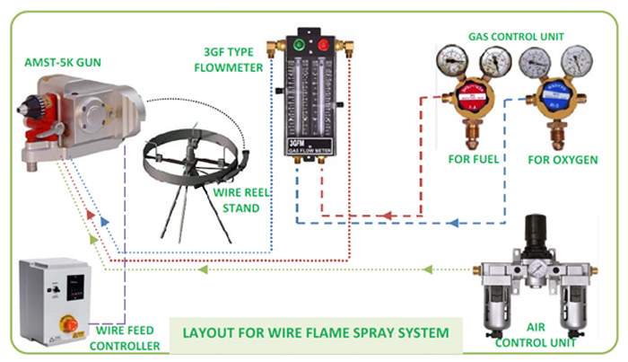 AMST-5K system is offered with AMST-5KG machine mount wire spray gun electric drive with wire feed control unit, 3GF Gas Flowmeter, wire reel stand with straightner, gas control unit, air control unit and hose sets.